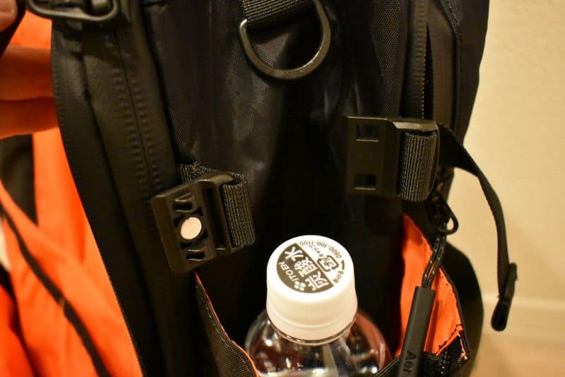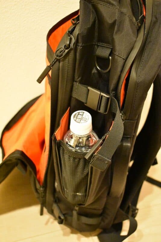 リュックのサイドにはドリンクホルダー(傘入れにもなるよ)が一つ付いている。ドリンクホルダーと傘入れはリュックの外にほしい!やっぱり、すぐ出したいし、バッグの中が濡れるのが嫌だよね。使わない時はファスナーを閉めればコンパクトになる。このデザインもいいっすね。