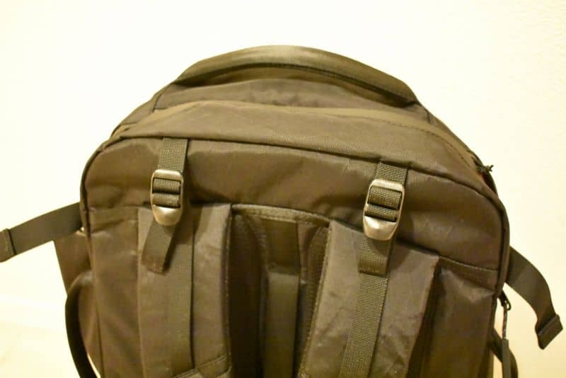 ベルトは厚みのあるクッションが重さを軽減(している感じがする)。ベルト上部にも調整バンドが(これ、「Travel Pack 2」にはない「3」に追加された機能)あり、より背中にフィットするように。これによりずれが少なくなっている。まだ使用回数が少ないけど頼りにしています。