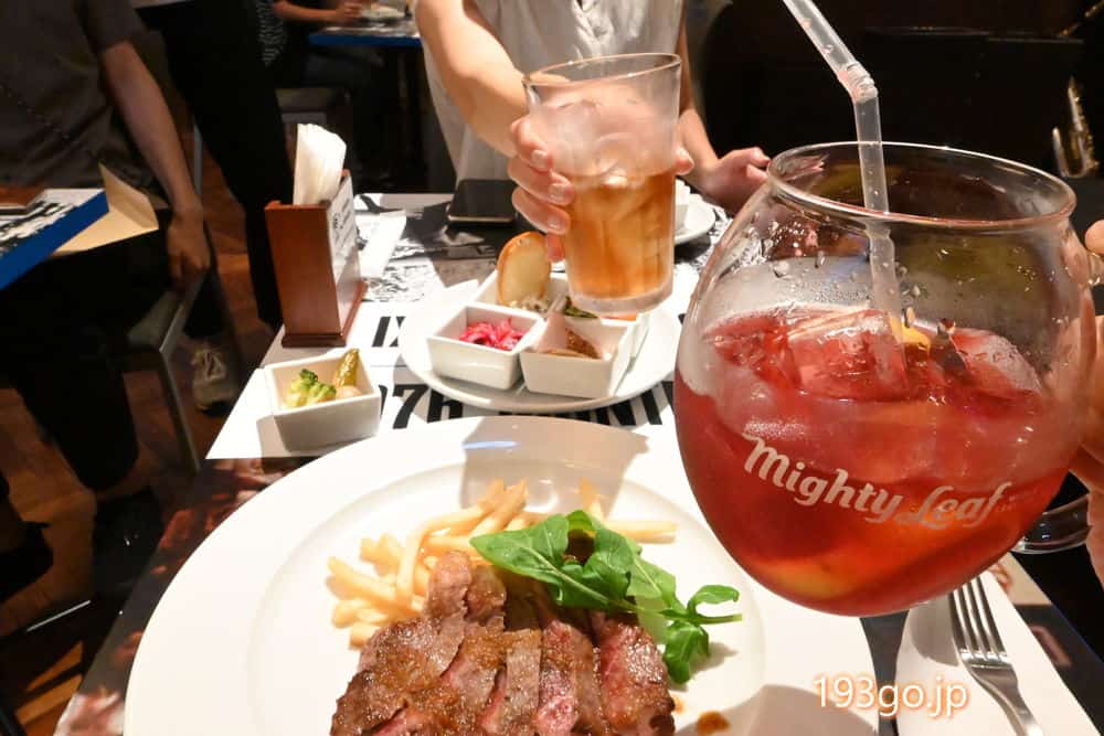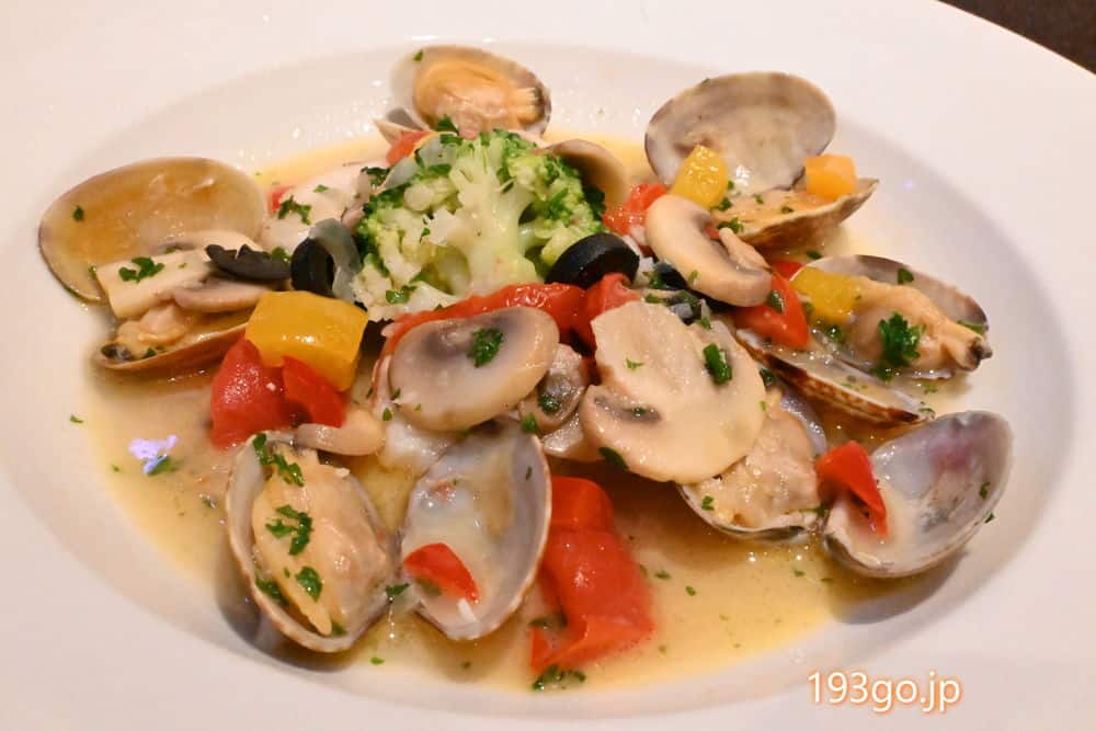 魚介出汁の効いた熱々のアクアパッツァ、ステーキはしっとり柔らかで食べ応えあり。