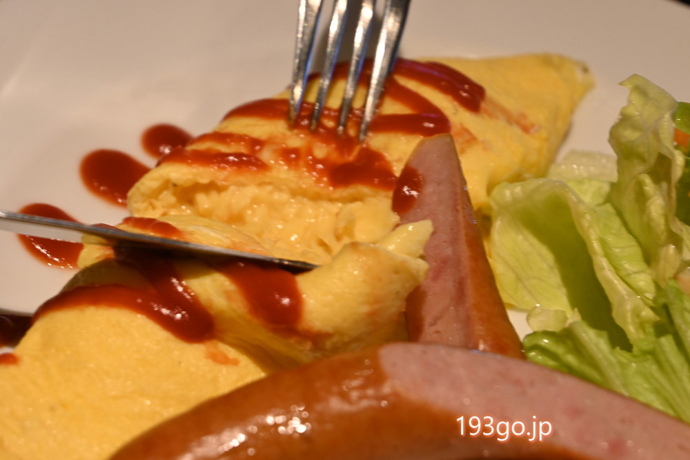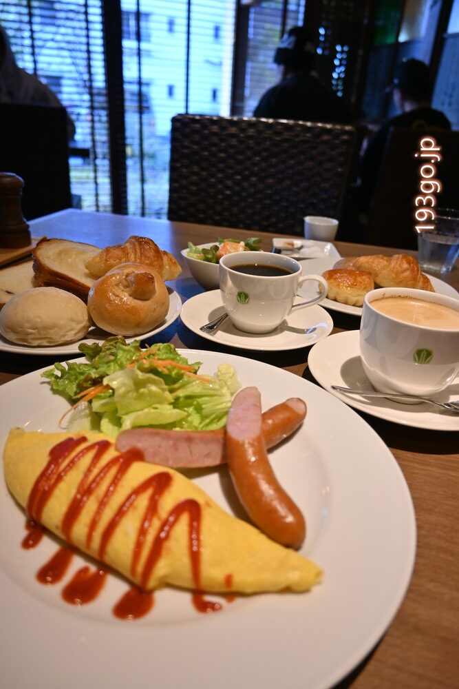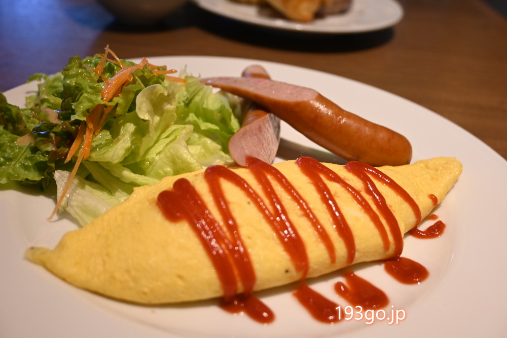 ブレンドコーヒー:605円に、プラス715円でオムレツ、ソーセージ、サラダのプレート。