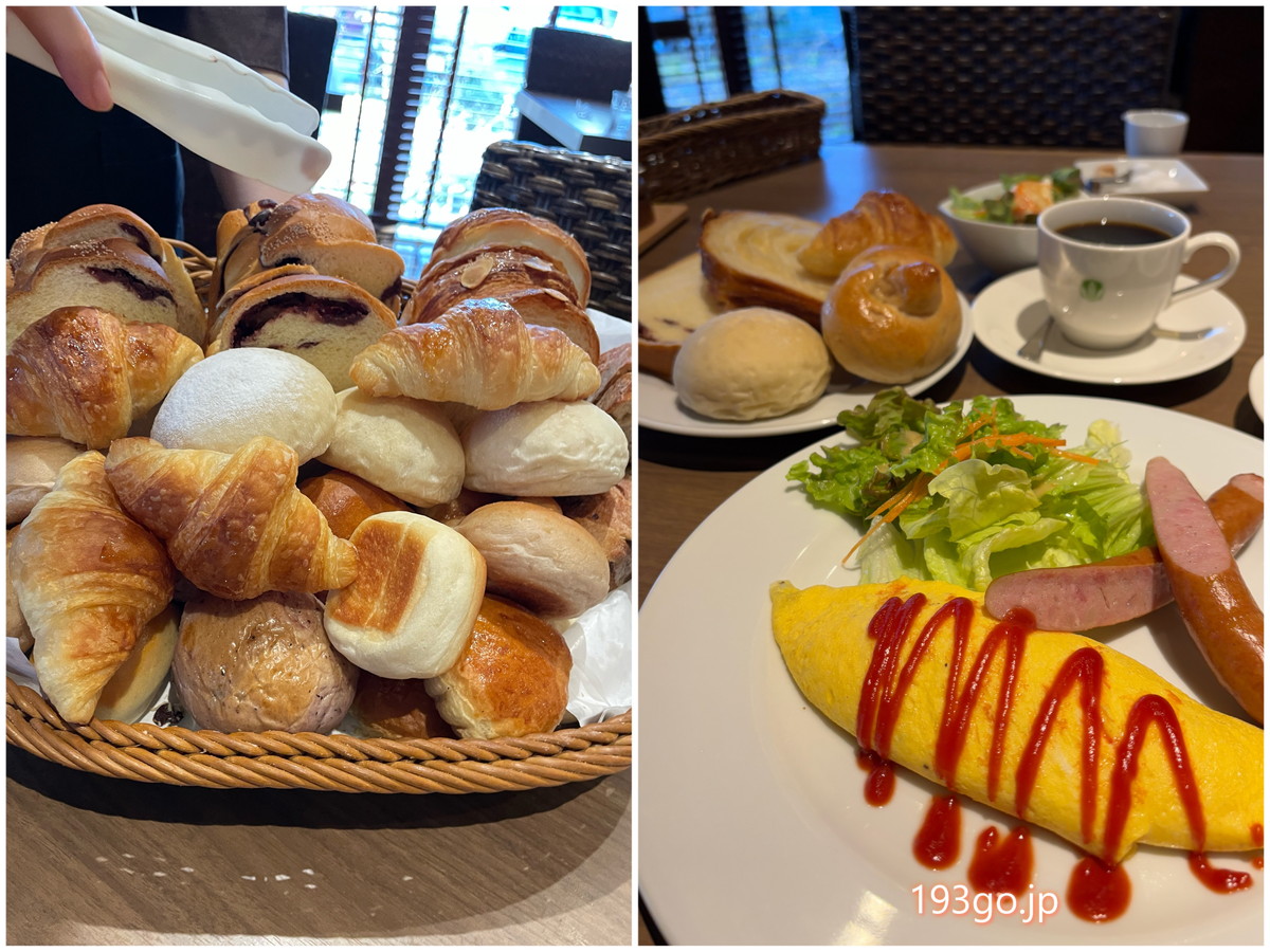 プリプリソーセージにふわとろオムレツ、パンも5個付いてホテルの朝食のような盛り付けに。