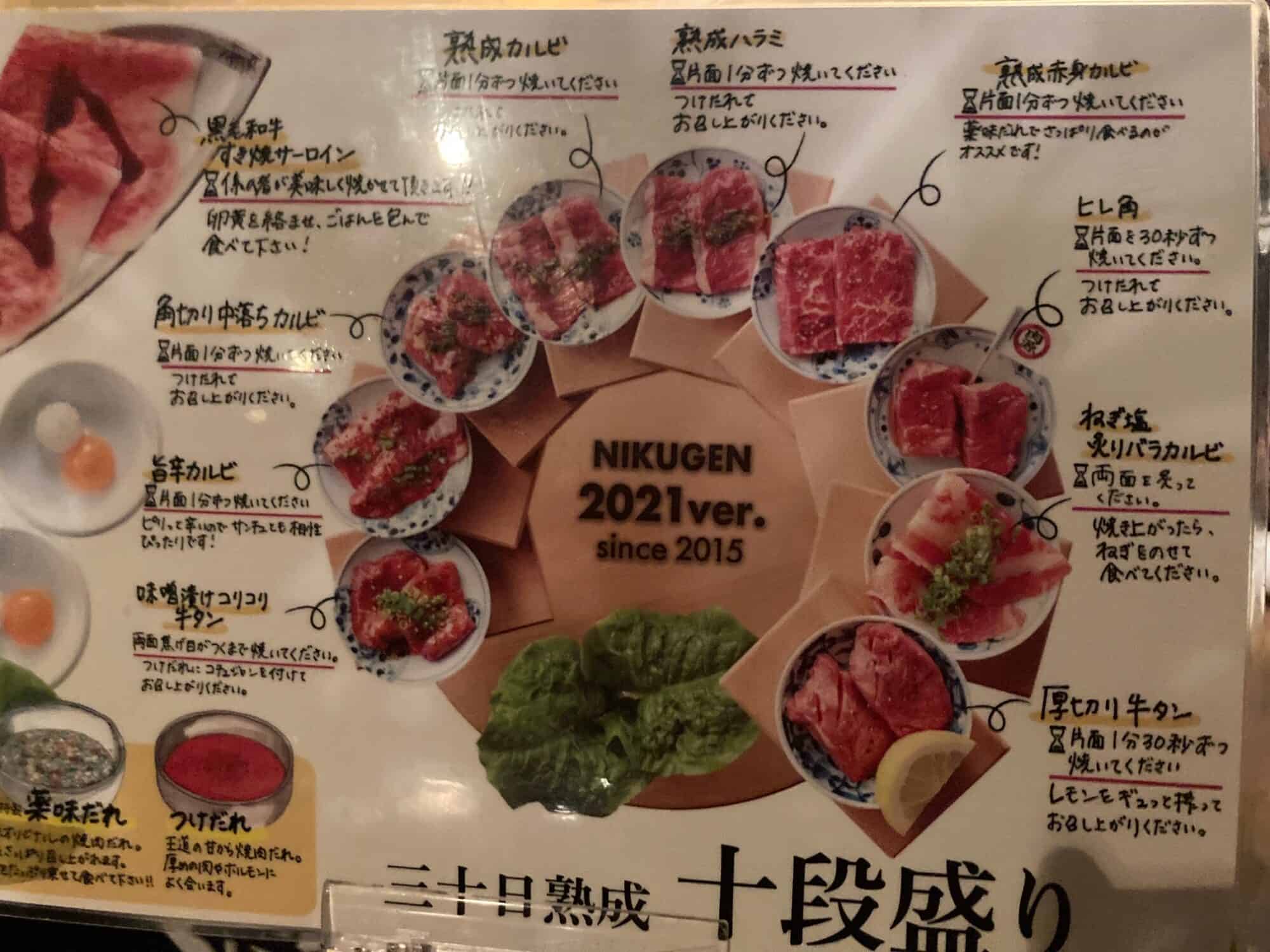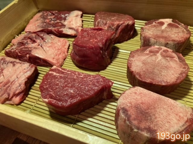 上から、厚切り牛タン、ネギ塩炙りバラカルビ、ヒレ角、熟成赤身カルビ、熟成ハラミ、熟成カルビ、角切り中落ちカルビ、旨辛カルビ、味噌漬けコリコリ牛タンが、二切れずつ。