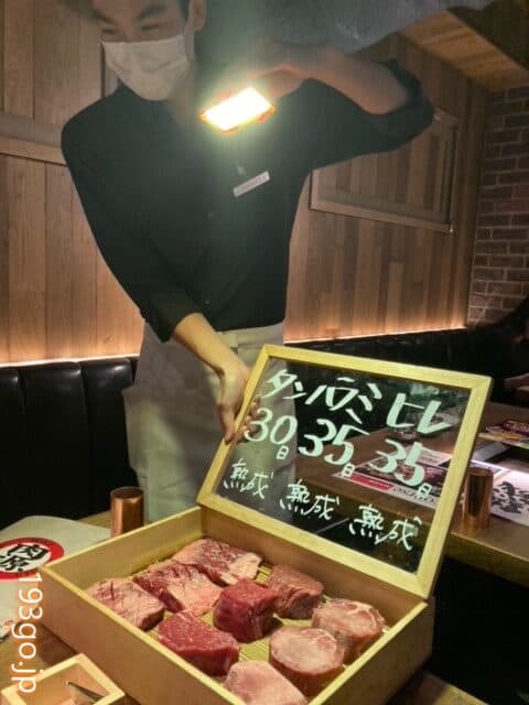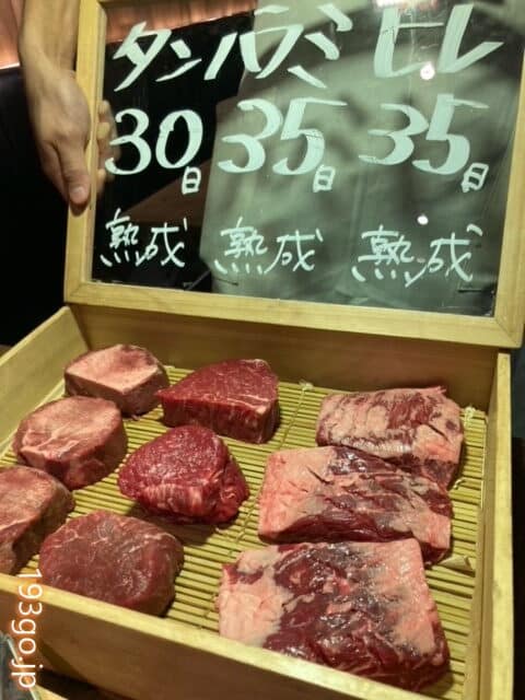 初めに、本日の熟成肉3種:タン、ハラミ、ヒレが木箱に並べられテーブルで見せてくれた。美しいツヤツヤの塊肉…!