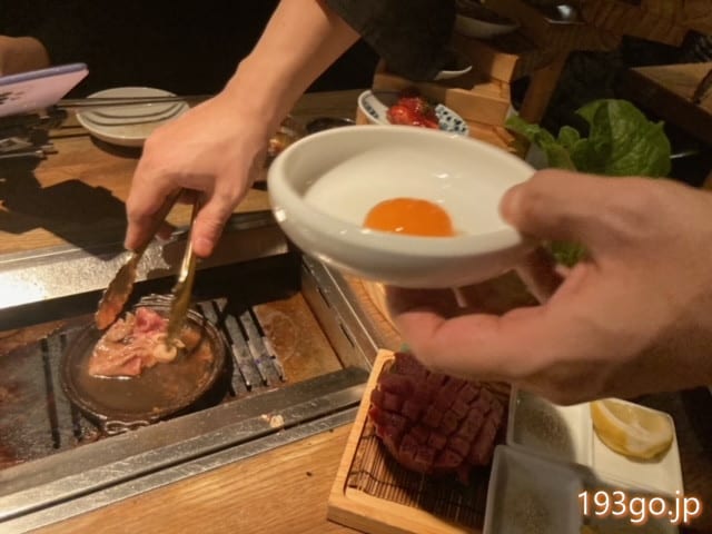 サシの入った柔らかな薄切り肉を網の上で温めたタレにからめ、溶き卵に付けて、一口ライスに巻いて頂きまぁす。