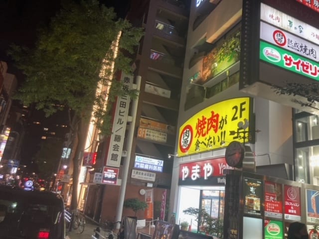 赤坂駅2番出口から徒歩1分、通り沿いに大きく「焼肉が食べたい!!」…焼肉食べたければここに行け!と言わんばかりの「肉源」