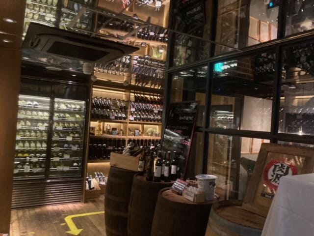 2Fに上がると、入口にワイン樽とワインセラーがあり、天井までボトルがズラリ。