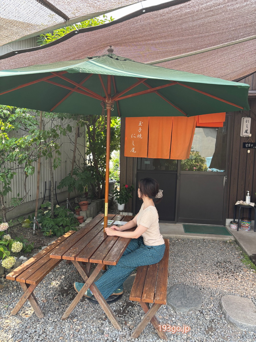 裏側に回るとお店の入り口が。パラソルが立てられたテラス席がありレトロな茶屋雰囲気。