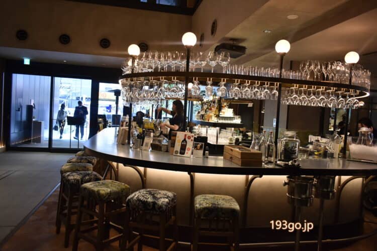 吹き抜け空間にアイランド型のバーカウンターがあるカッコいいレストラン、夜も雰囲気が良い。