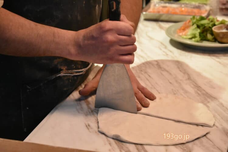 もちもちした生地を手で伸ばし半分にカットして窯の中へ。