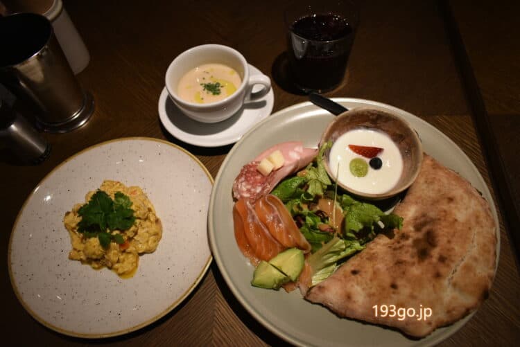 フォカッチャをメインに、選べる卵料理、本日のスープ、フルーツヨーグルト&ドリンク付き。