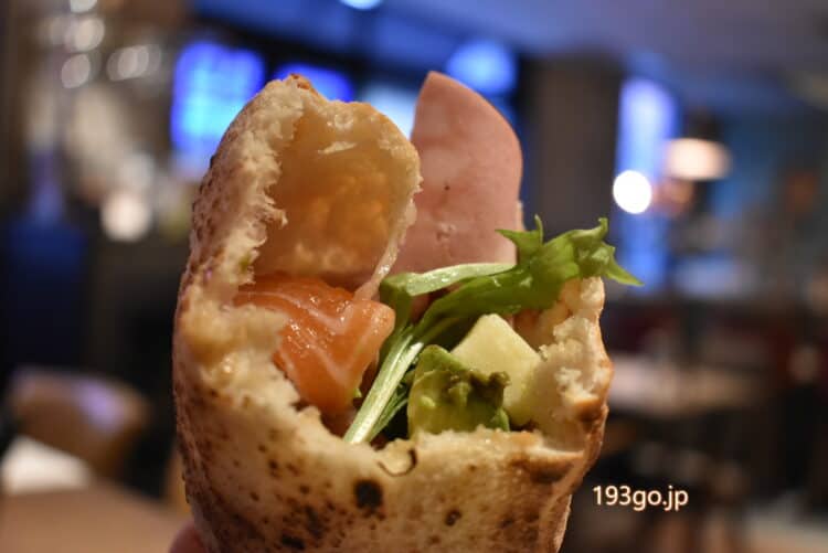 もっちりした歯ごたえの生地にしっとりハムやサーモンの塩味、チーズも程よくとろけ新鮮なシャキシャキ野菜もたっぷり、モリモリ!