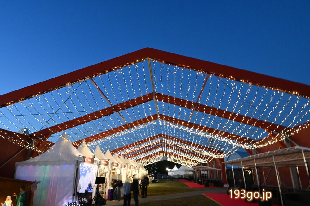 入場口を入り、クリスマス雑貨やお菓子などを販売するテントが並ぶイルミネーションルーフを通り中へ。