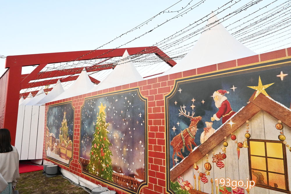 正面には全長10メートルのもみの木のツリー、オブジェやフードテントが軒を連ねる楽しいマーケットの雰囲気に包まれる。