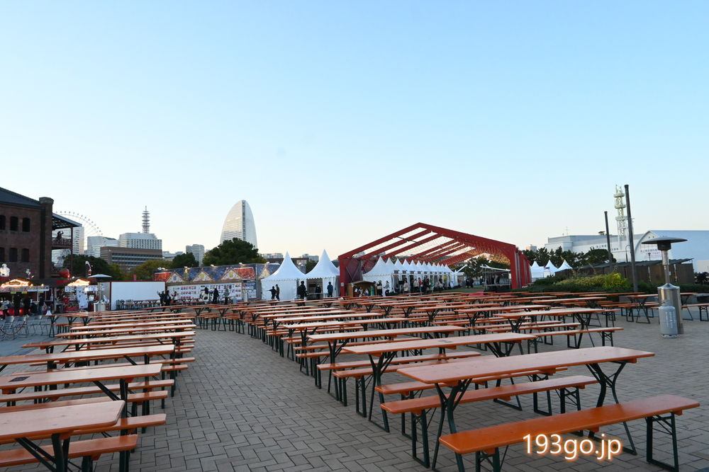 暗くなると大観覧車「コスモクロック21」や「ヨコハマ グランド インターコンチネンタル ホテル」などの横浜らしい景色や赤レンガ倉庫のライトアップで、さらに会場は盛り上がる。