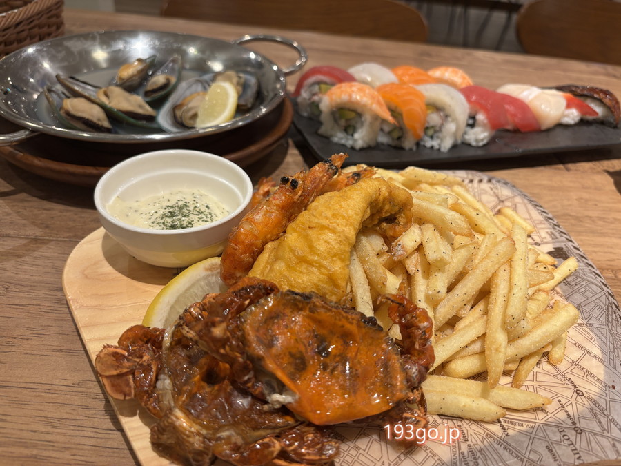メニューは寿司、ピザ、パスタ、前菜、フライ盛り合わせなどのシーフード料理。