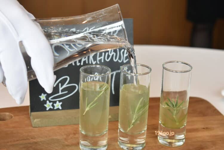 まず初めにオリジナルのウェルカムドリンクが。テーブルでトニックウォーターを注いでくれる。