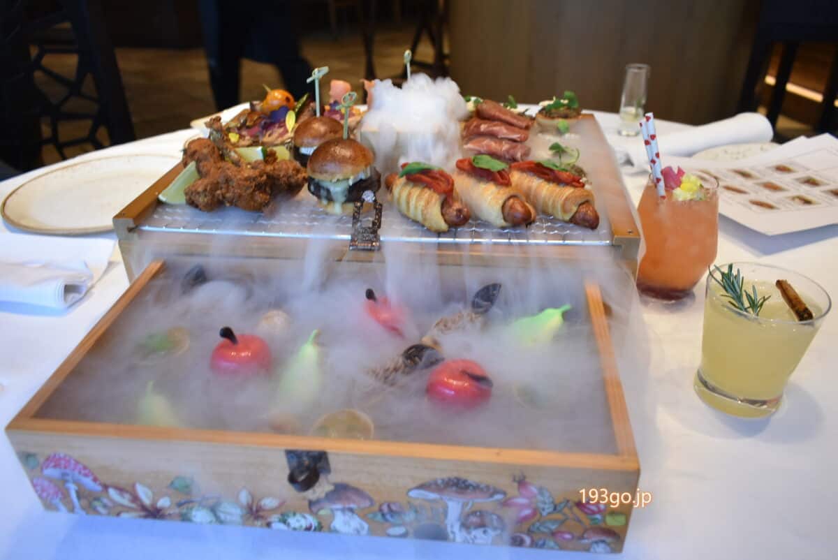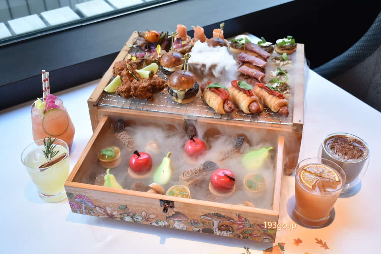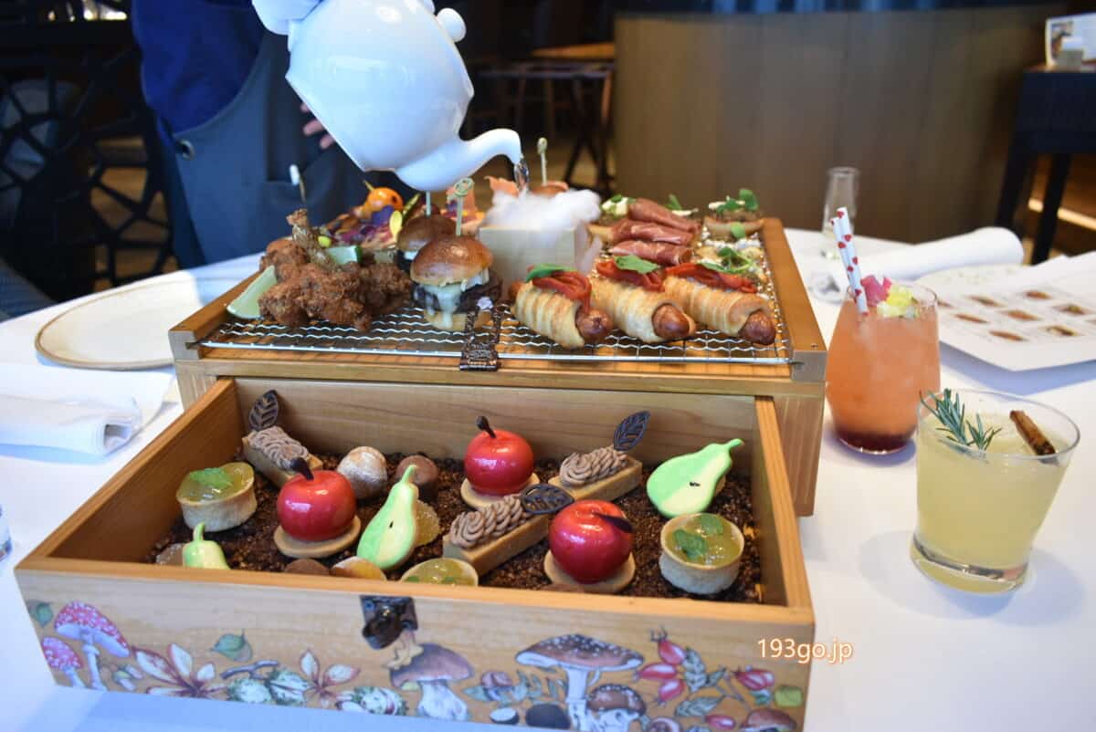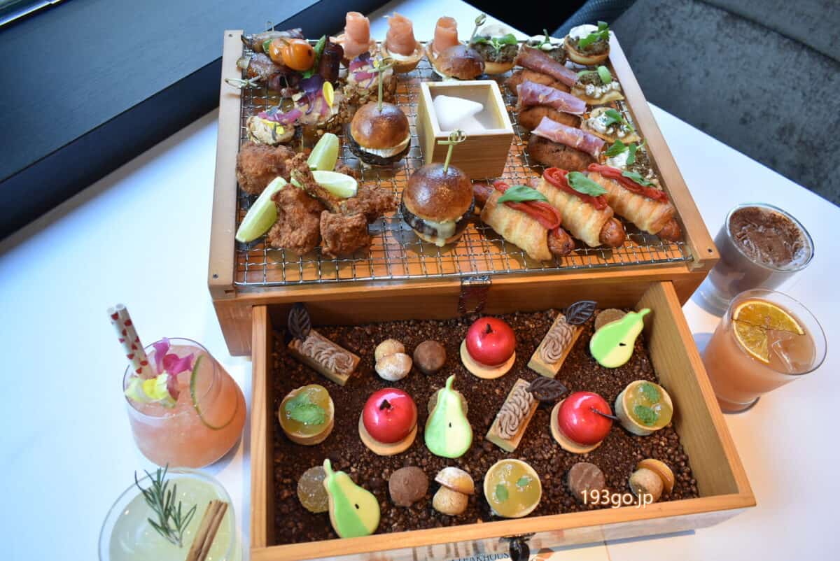 箱の上に並ぶセイボリーはトリュフバーガーにハムコロッケ、フライドチキン、チョリソーロール、スモークサーモン…どれも食欲をそそる食事メニューでミニサイズで色々食べられ手に取るたびにワクワク!