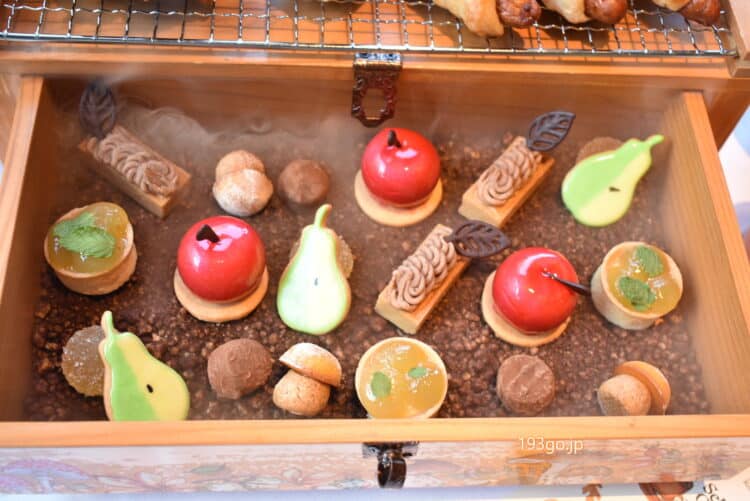 引き出しから小さなリンゴや洋梨…カラフルなプチガトー