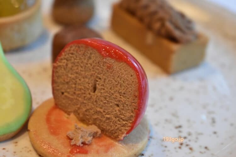 リンゴに見立てたチョコレートムースや、洋梨のクッキー、キノコの笠はカボチャのフィナンシェ 軸はシナモンクッキーと、見た目もユニークで可愛らしいスイーツ。