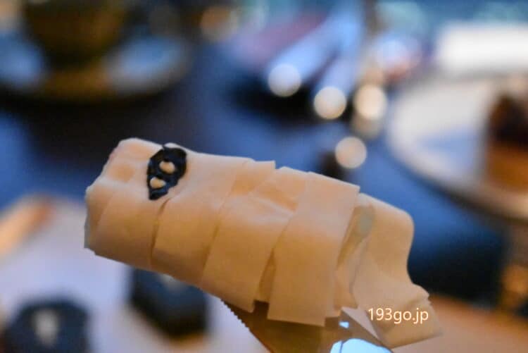 特にお気に入りは紫芋モンブランと、海老ムースの“ミイラ”、竹炭の塩サブレにスモークサーモン&サワークリームがサンドされた“棺桶”も美味しかった!