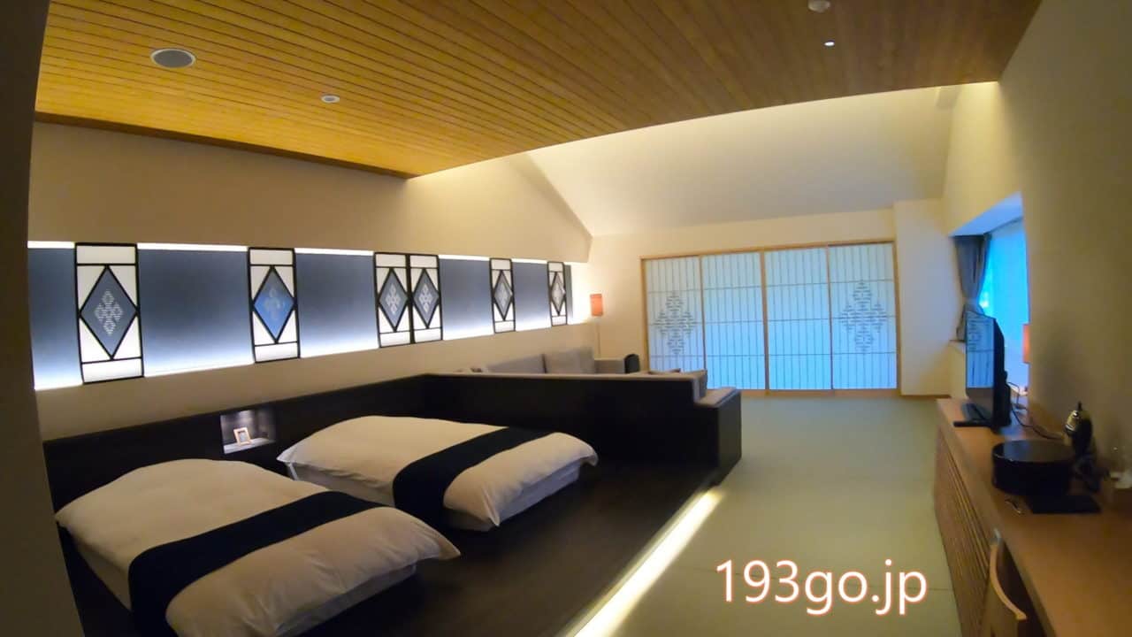 先ほど通って来た廊下と同じように、津軽こぎんが障子にも配され、「こぎんウォール」はライトを付けると模様がくっきりと浮かび上がる。