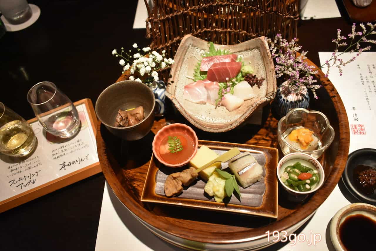 1つの器に八寸と酢の物、お造りが盛り付けられ、とても華やか!