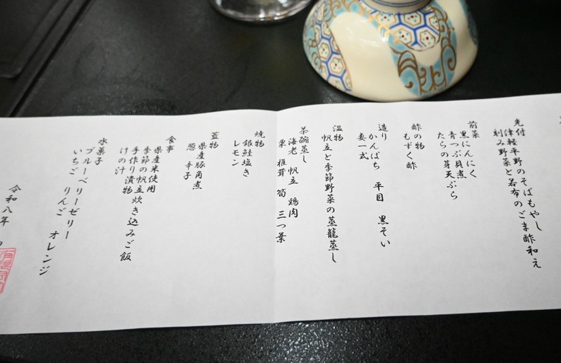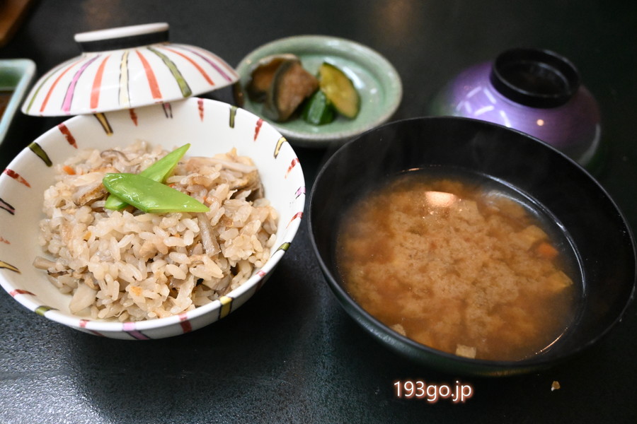帆立の炊き込みご飯、けの汁、デザートのブルーベリーゼリーまで、