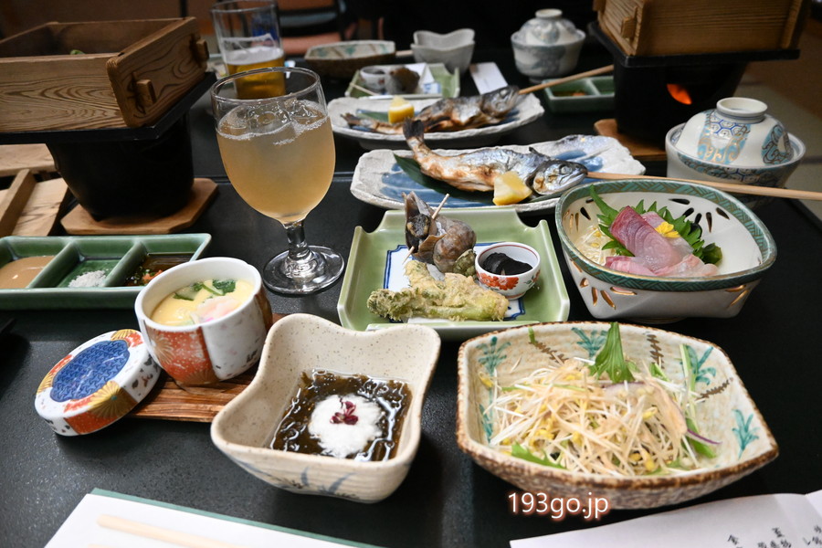 せいろ蒸し野菜やお造りの盛り合わせ、岩魚(いわな)、栗入りの茶碗蒸し、