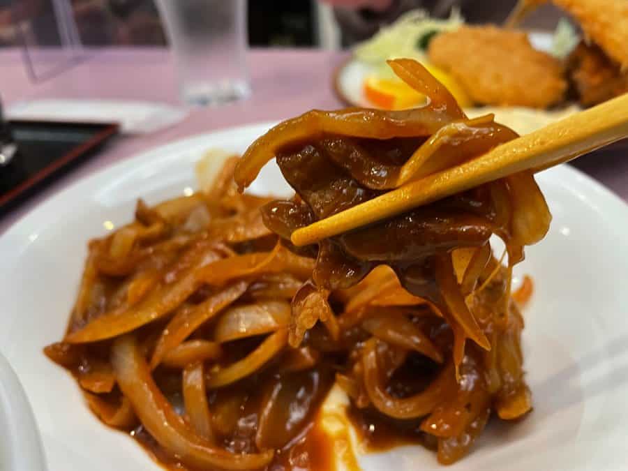 玉ねぎと豚肉をオリジナルソースで炒めている。