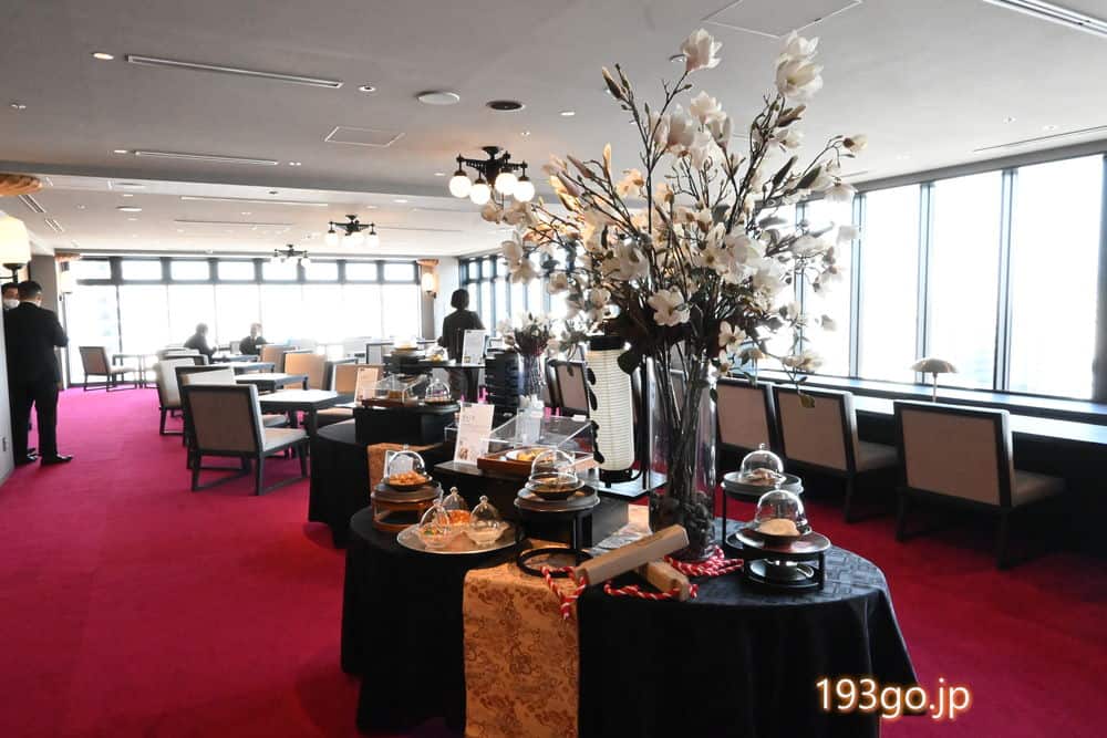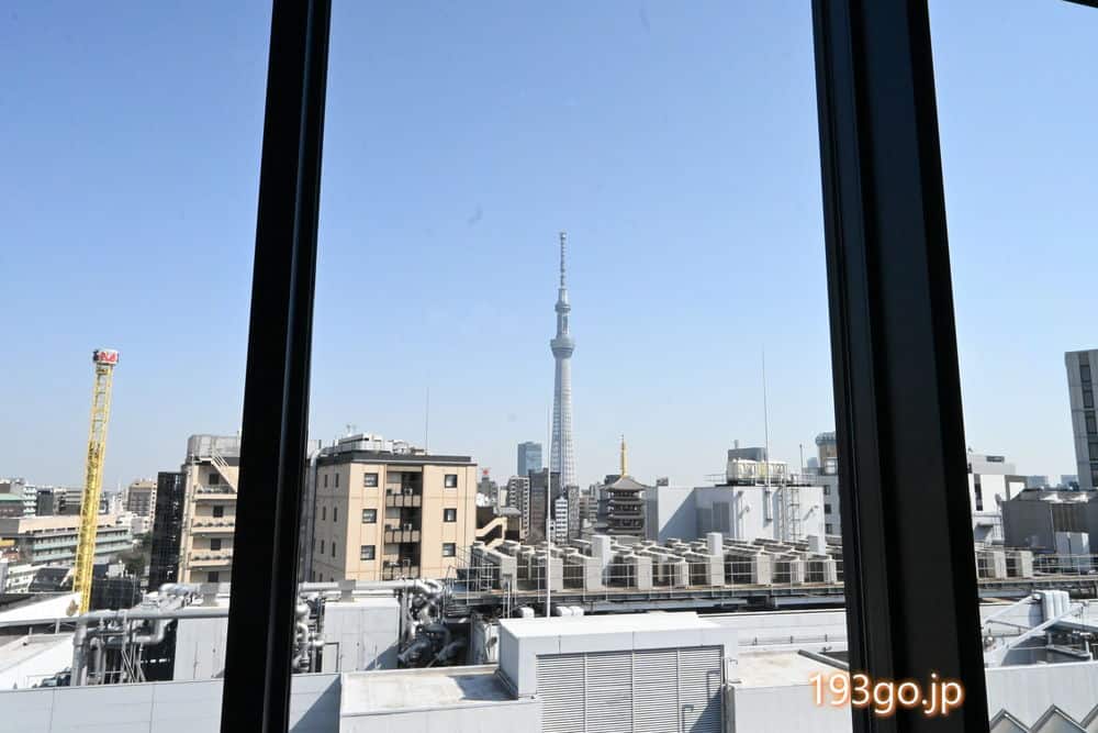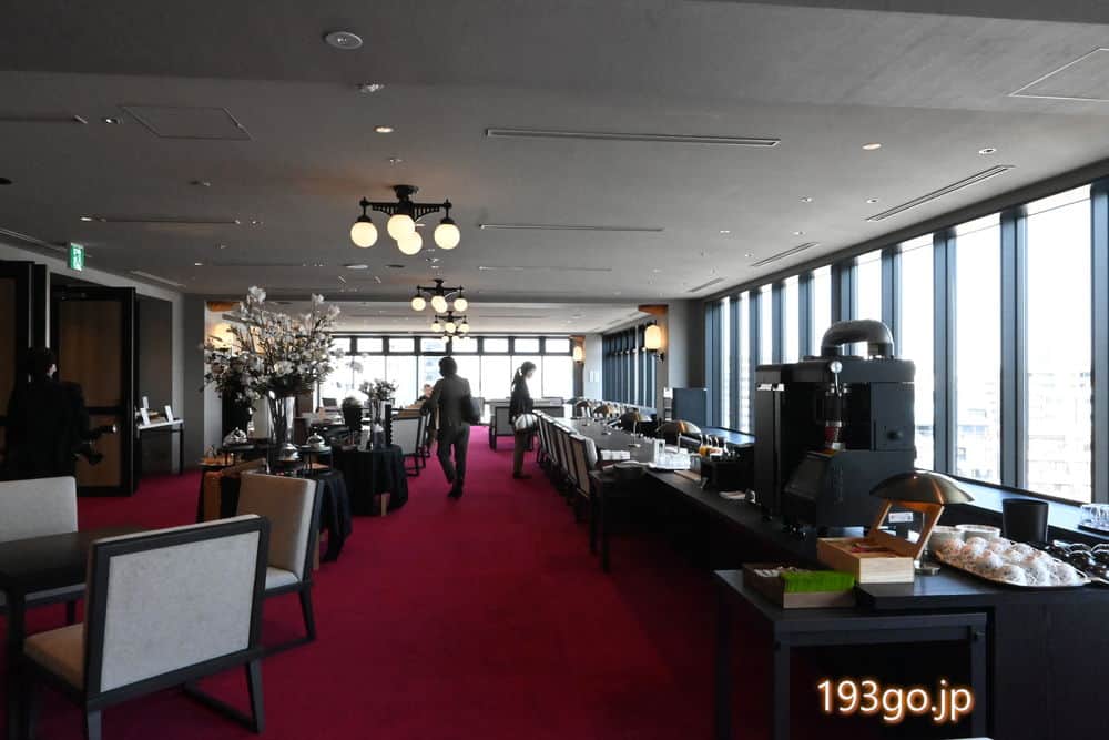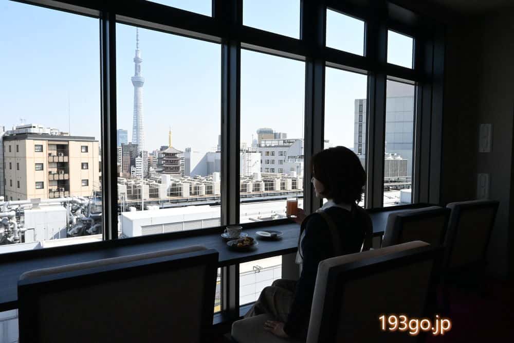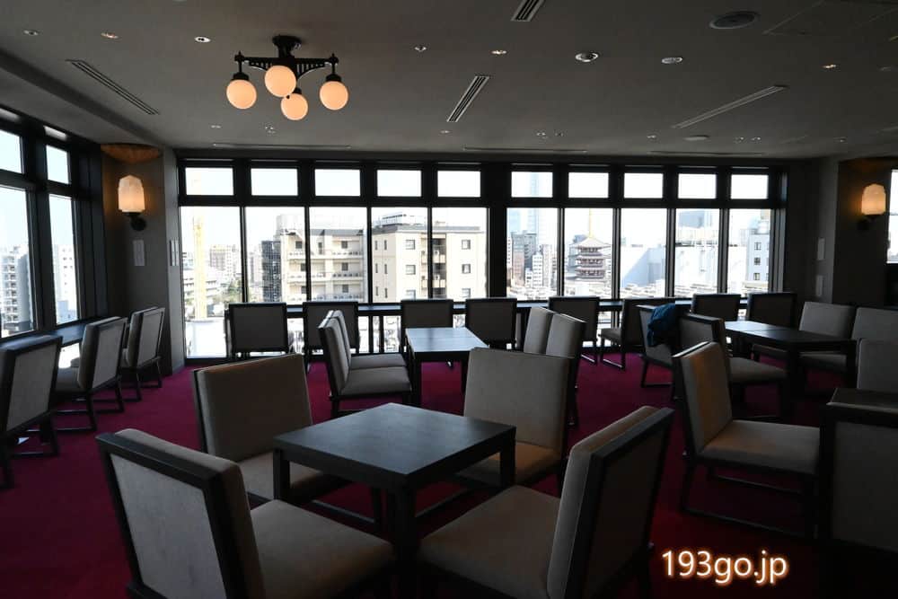 中へ足を踏み入れると、赤いじゅうたんに、浅草の街や東京スカイツリーが一望できる大きな窓が開放感がありクラシカルな空間。