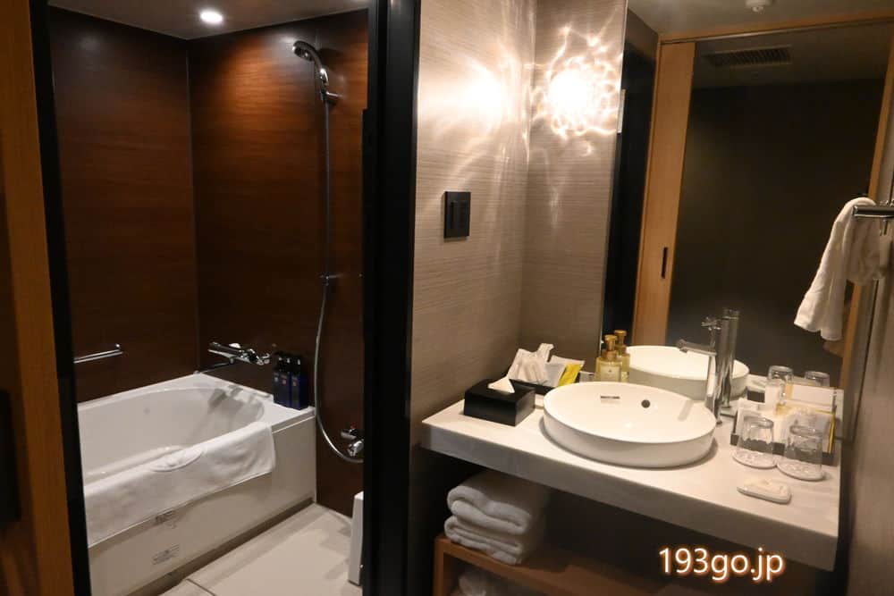 洗面台にはアメニティが揃う。バスソルトやボディタオル、MIKIMOTO(ミキモト)のスキンケアキットも嬉しい!