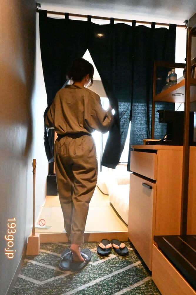 のれんをくぐり、小上がりの室内へ。畳敷きにローベッドのリラックスできる空間。窓側にソファーとテーブル。このソファーは広げるとベッドにもなる。