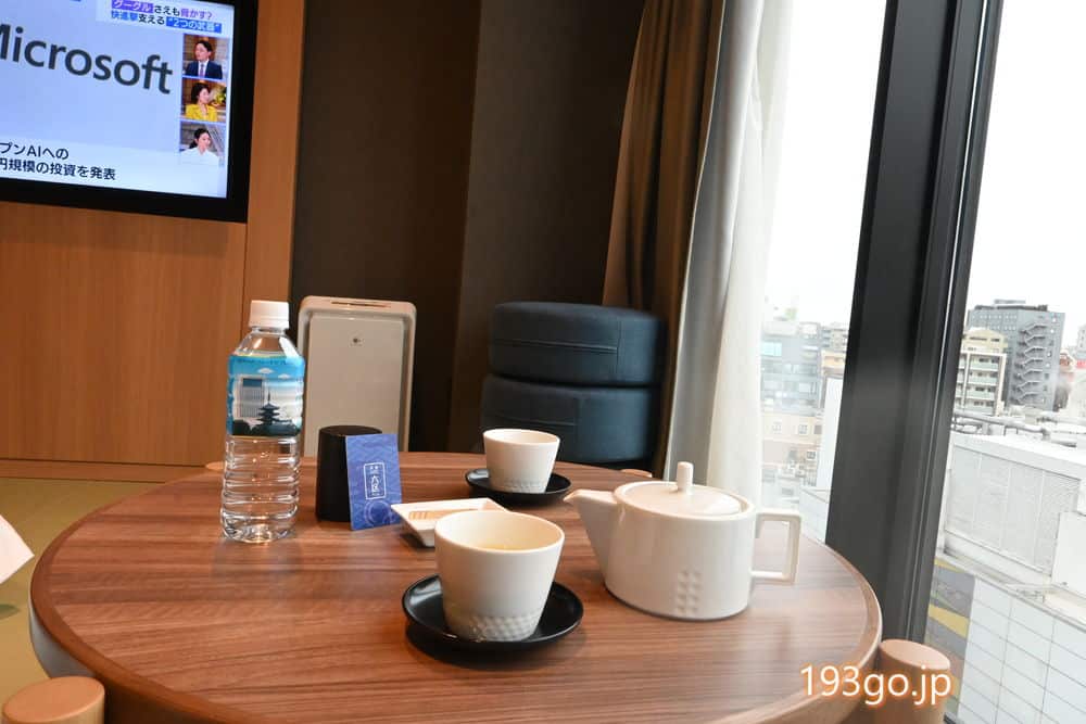 ラウンジで、あんこ玉や雷おこしなど浅草らしいキュートな和菓子。ドリンクはキウイやグァバなどのフレッシュジュース4種、自家焙煎珈琲、日本茶、紅茶が楽しめた。
