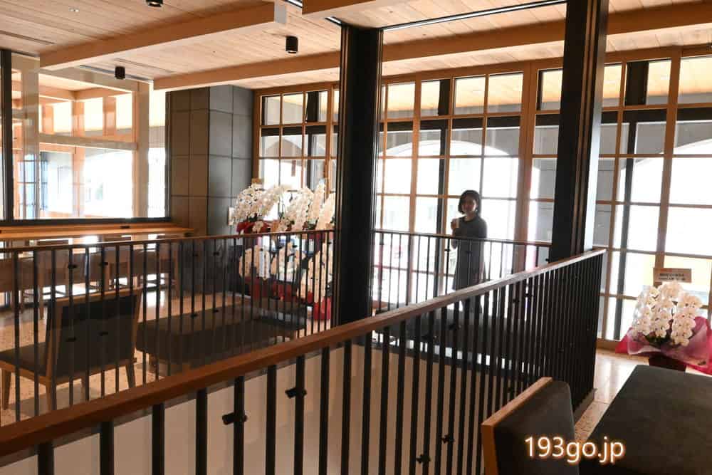 奥のスペースは1階から吹き抜けの空間に、大きな窓から町並みが見え開放感たっぷり。