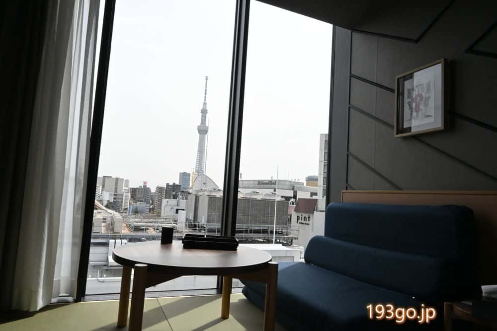小上がりの畳の間でリラックス 窓からはスカイツリーや浅草寺