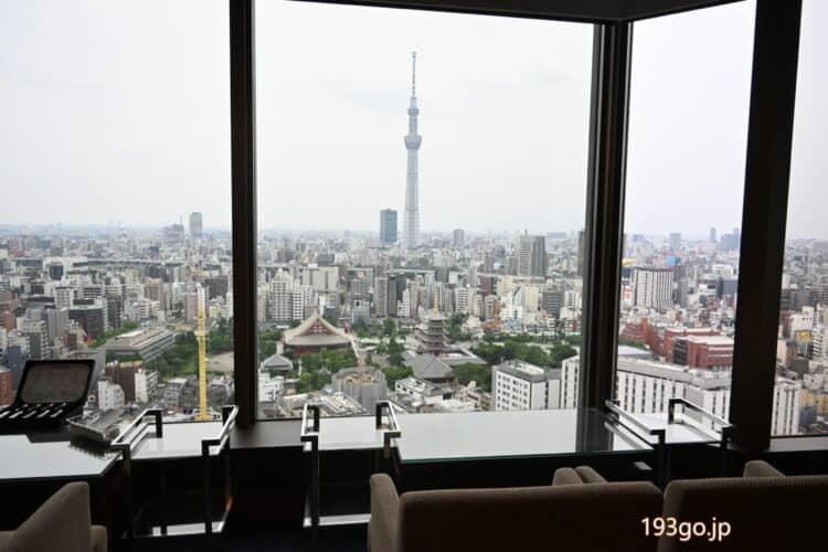 店内に入ると、壁一面のガラス張りに絶景が広がる。目の前にはスカイツリーにアサヒビールの黄金のオブジェ、眼下には浅草寺、五重塔、仲見世通り、花やしきと浅草の人気スポット名物が勢ぞろい。まるで空に浮かんでいる様な景色に思わず感激。