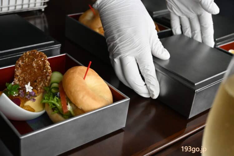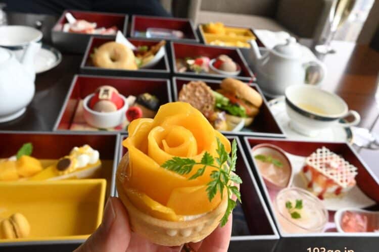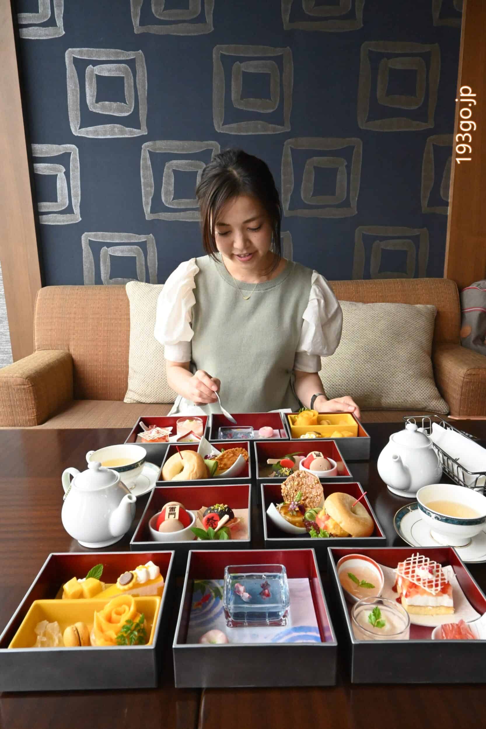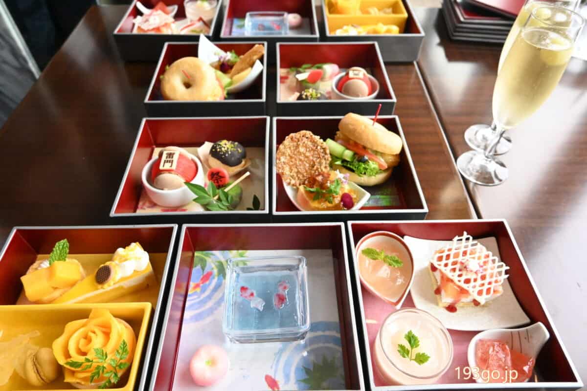 夏のアフタヌーンティー「きらめきの夏詩箱」は、定番のスタンドではなく、浅草の五重塔をイメージした五つの重箱で提供される。和のモチーフはこの地ならでは。1つずつ箱を開ける楽しみが。