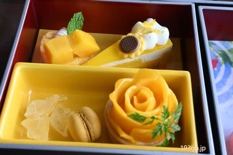 鮮やかな夏フルーツのマンゴーのお重には、花弁デコレーションの生マンゴーのタルトに、キュートな向日葵モチーフのヨーグルトムース。