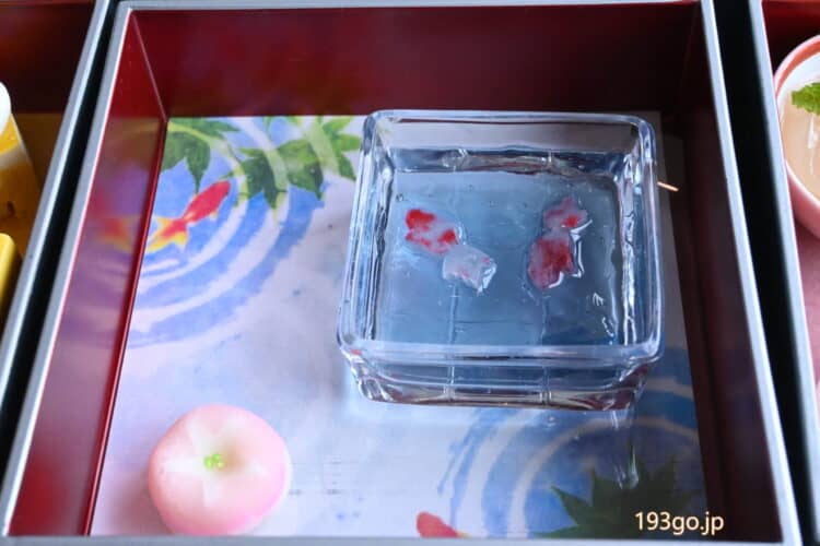 夏祭りの金魚すくいをイメージした金魚ゼリーも涼し気。透き通る青い色のハーブティー「バタフライピー」で流水を表現し、金魚のゼリーは、琥珀糖の細工。アサガオに見立てた、白餡の和菓子が添えられ、眺めているだけで涼し気で情緒ある一重。