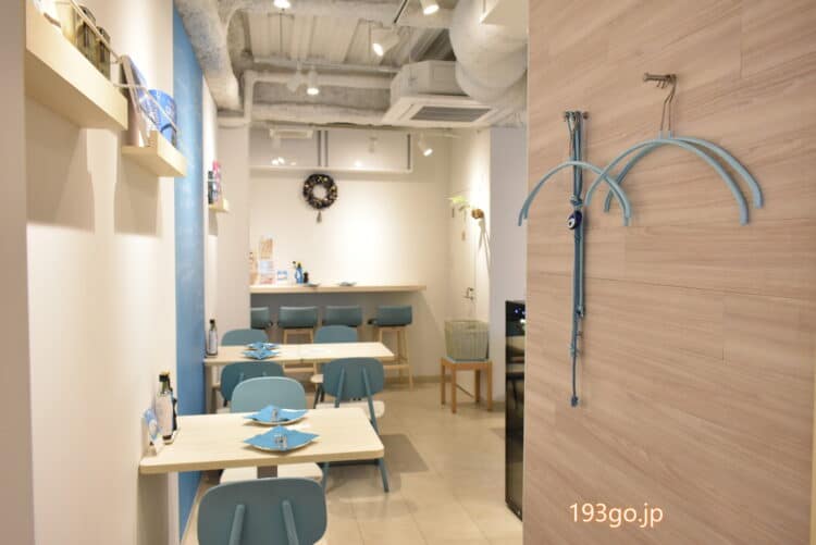 店内は、真っ白の壁に、インテリアやお皿もブルー×ホワイトで統一され、