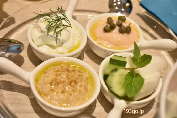 卓上にセットされたギリシャから直輸入のオリーブオイルやホワイトバルサミコ酢をかけて楽しむのも良い。