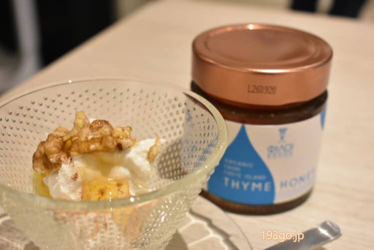 こっくりとした濃いギリシャヨーグルトは、ハチミツとシナモンと、クルミで食べるのが定番。