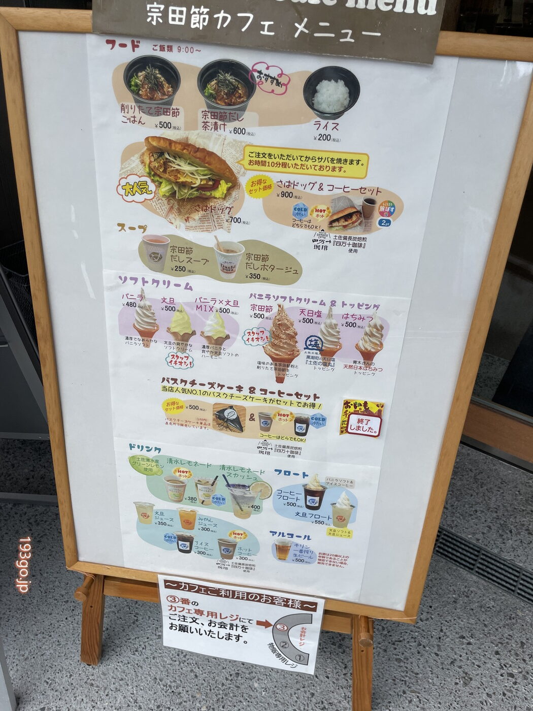 宗田節だし茶漬けや鯖ドッグ、ソフトクリームなどのメニュー。