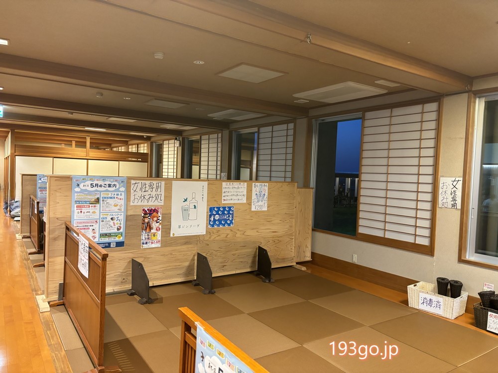 枕が置かれ寝ころべる畳の休憩スペース。女性専用エリアは空いていた。窓からの風景をみながらのんびり。