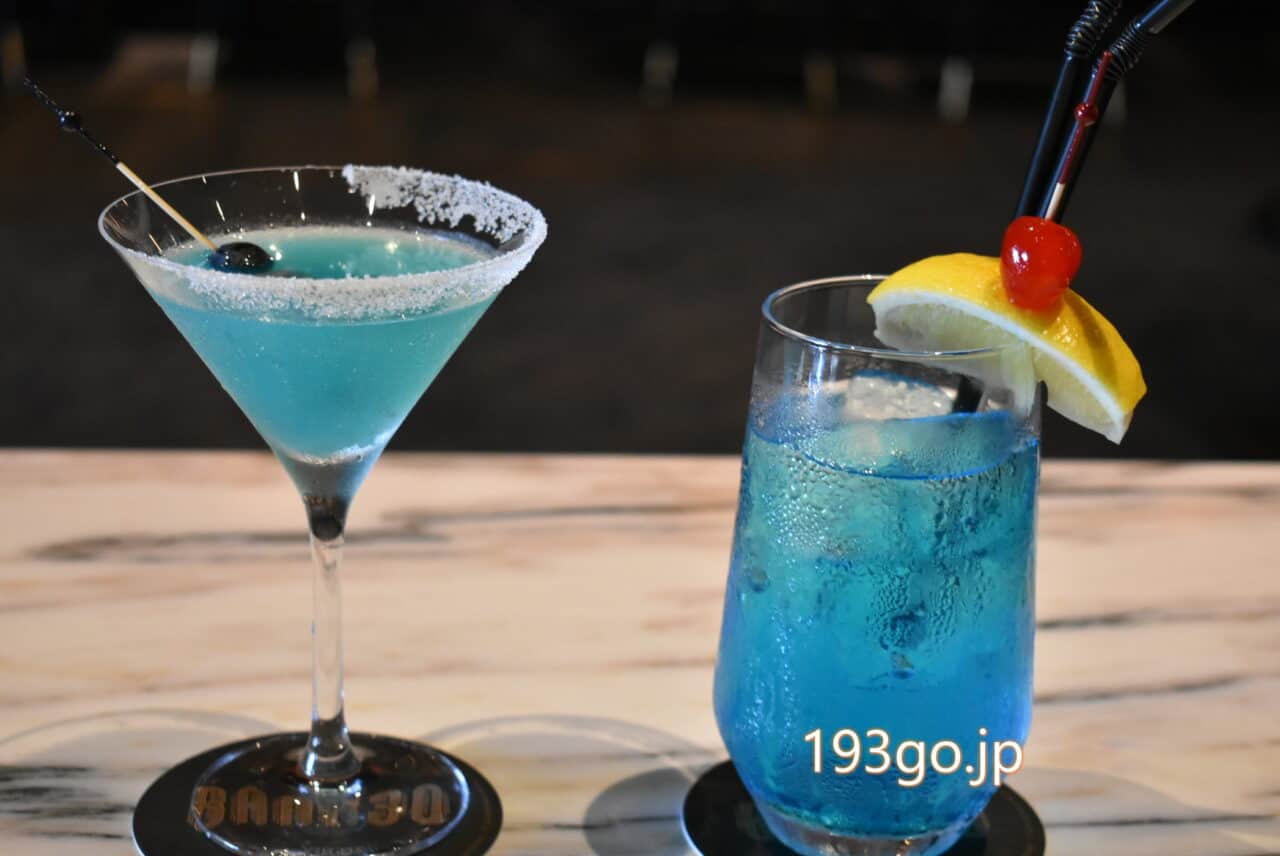 鮮やかなブルーの2種のドリンクとアイスケーキ。