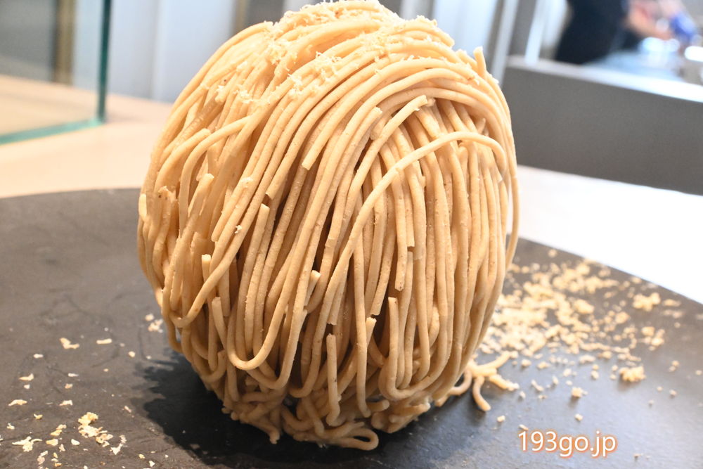 落ち着いた店内のカウンター席では、目の前で仕上げるモンブランを楽しめる。