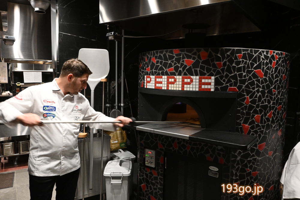 生地を伸ばしトッピングをしてピザ窯で焼き上げる焼きたてピザを提供。