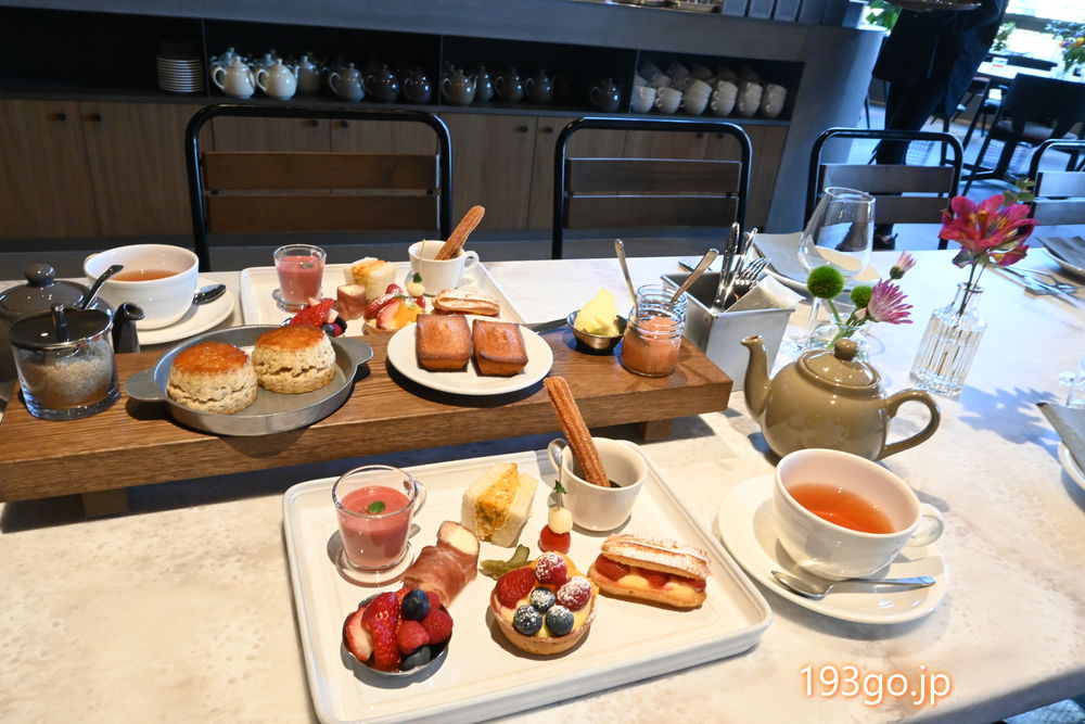 フルーツタルト、フルーツエクレア、エッグサンド、カプレーゼピンチョス、苺のスープなどを盛り付けたプレートにスコーンやフィナンシェがセットになった豪華なメニュー。