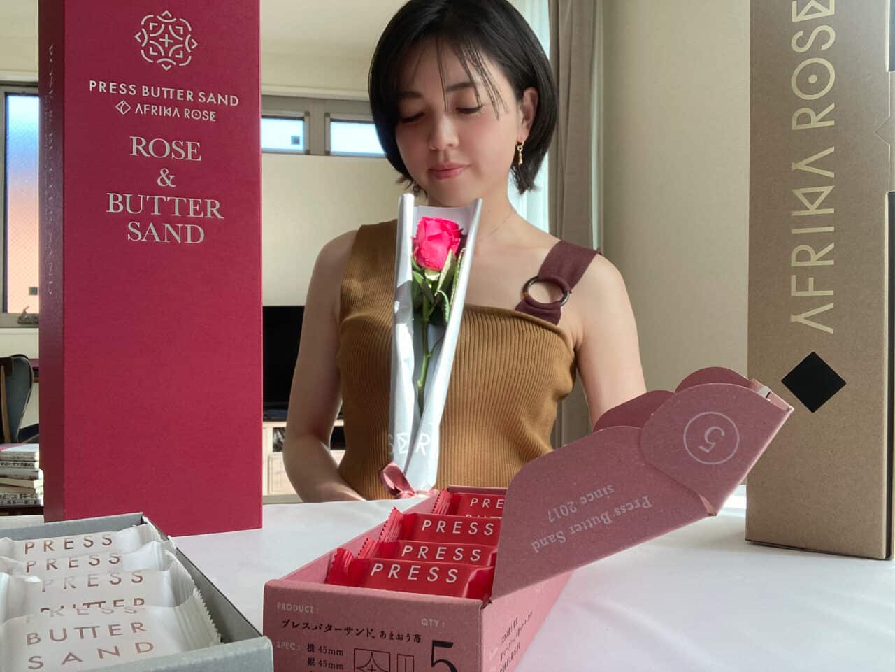 バラ一輪が入ったボックスと、2層仕立てのバターサンドに、九州限定フレーバーのあまおう苺バターサンドが1箱ずつ、ローズピンクのスリーブにセットされた数量限定のギフト。