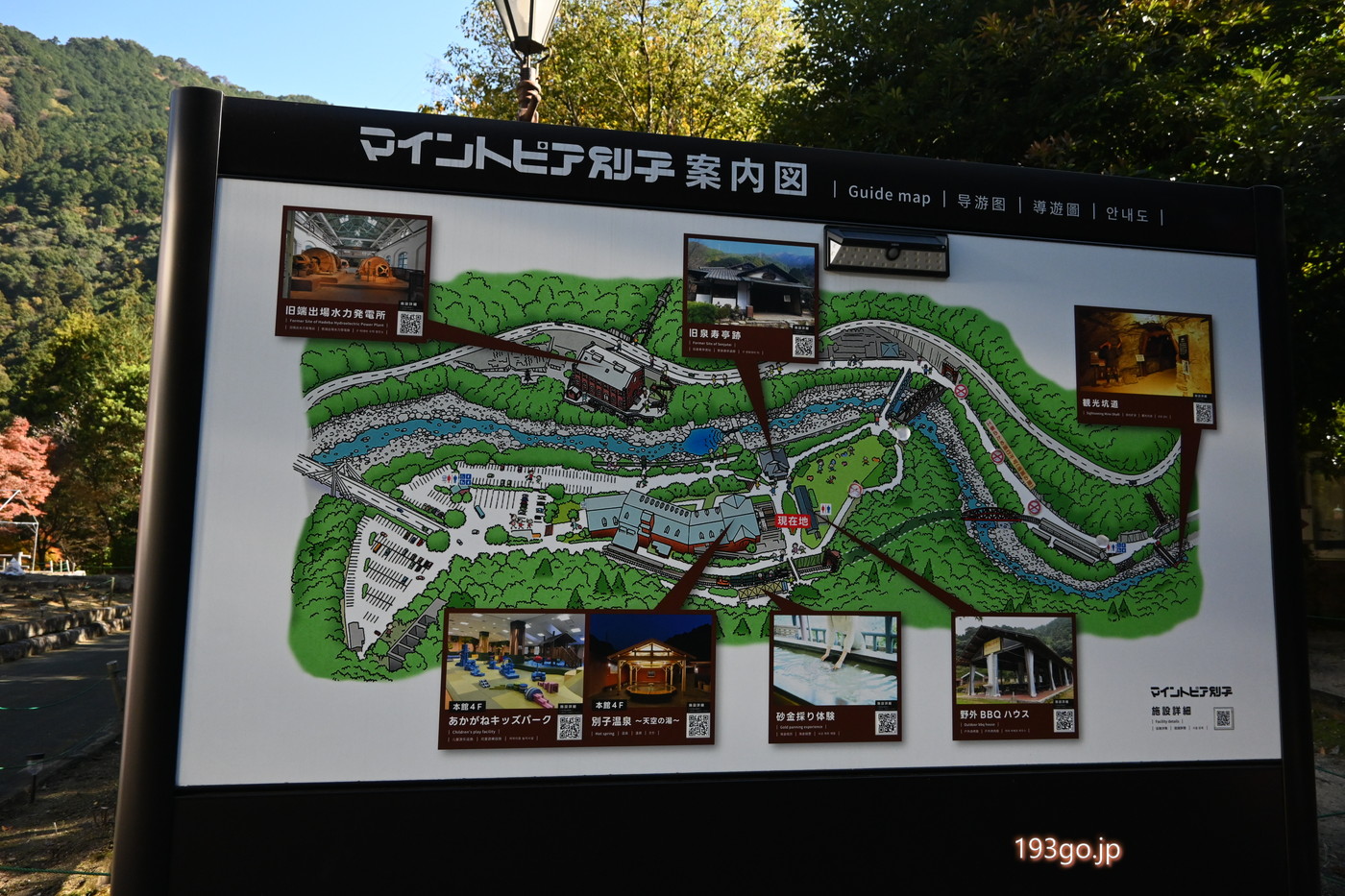 売店、レストラン、カフェ、バーベキュー場、砂金採り場、トロッコ列車、鉱山坑道、旧端出場水力発電所、温泉施設が備わり、様々な体験が出来る。